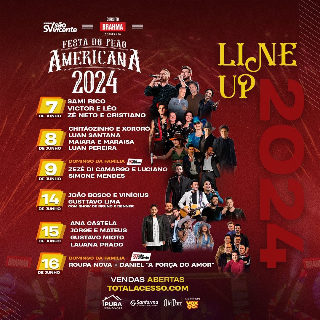 Na sexta (7), Sâmi Rico, Victor & Léo e Zé Neto & Cristiano abrem a programação musical após os duelos das modalidades três tambores e montaria em touros. No sábado, (8), quatro super shows reunirão diferentes gerações: Chitãozinho & Xororó, Luan Santana, Maiara & Maraísa e Luan Pereira. No primeiro Domingo da Família São Vicente, com ingressos a preços populares, se apresentam Zezé di Camargo & Luciano e Simone Mendes.